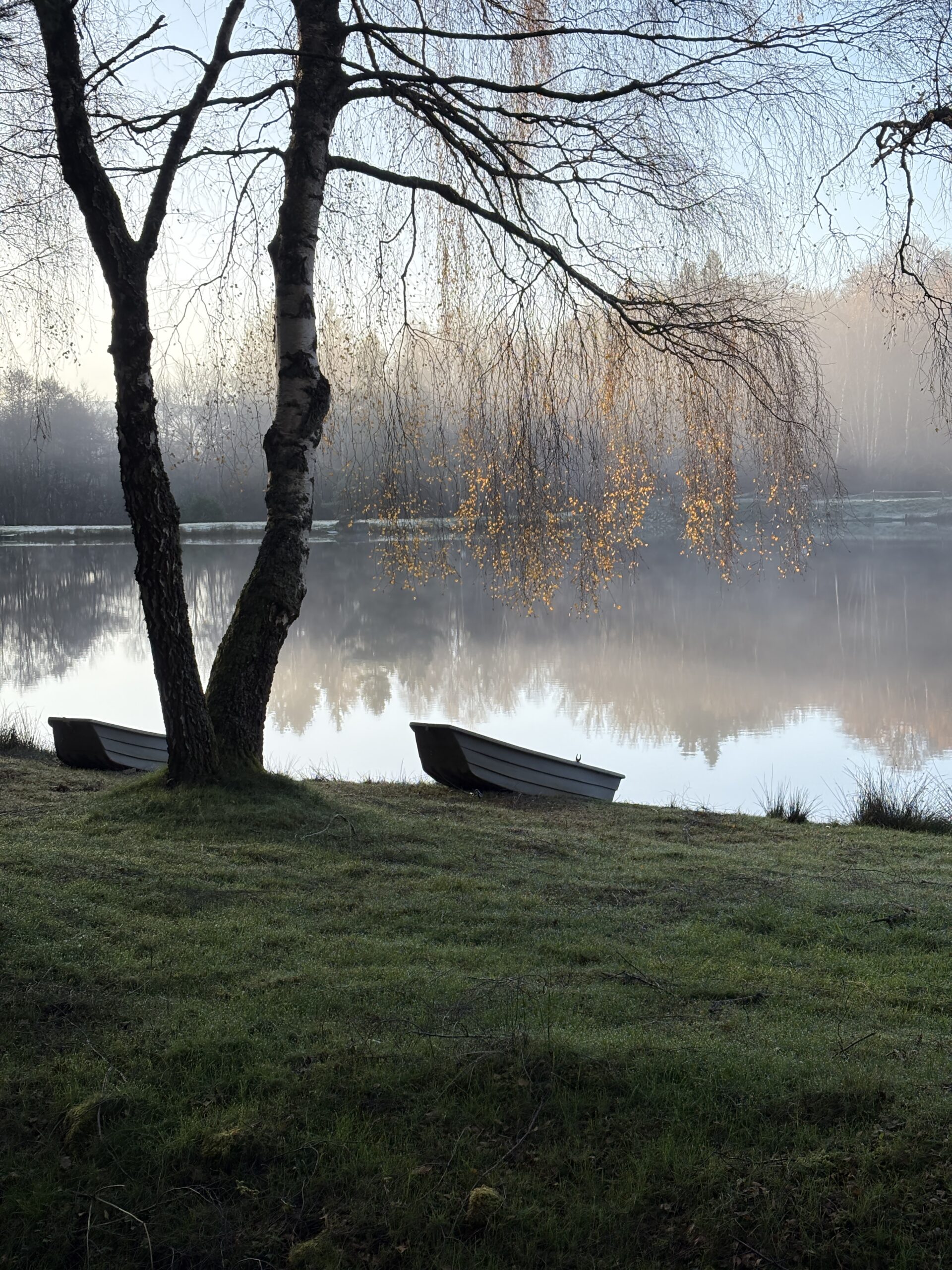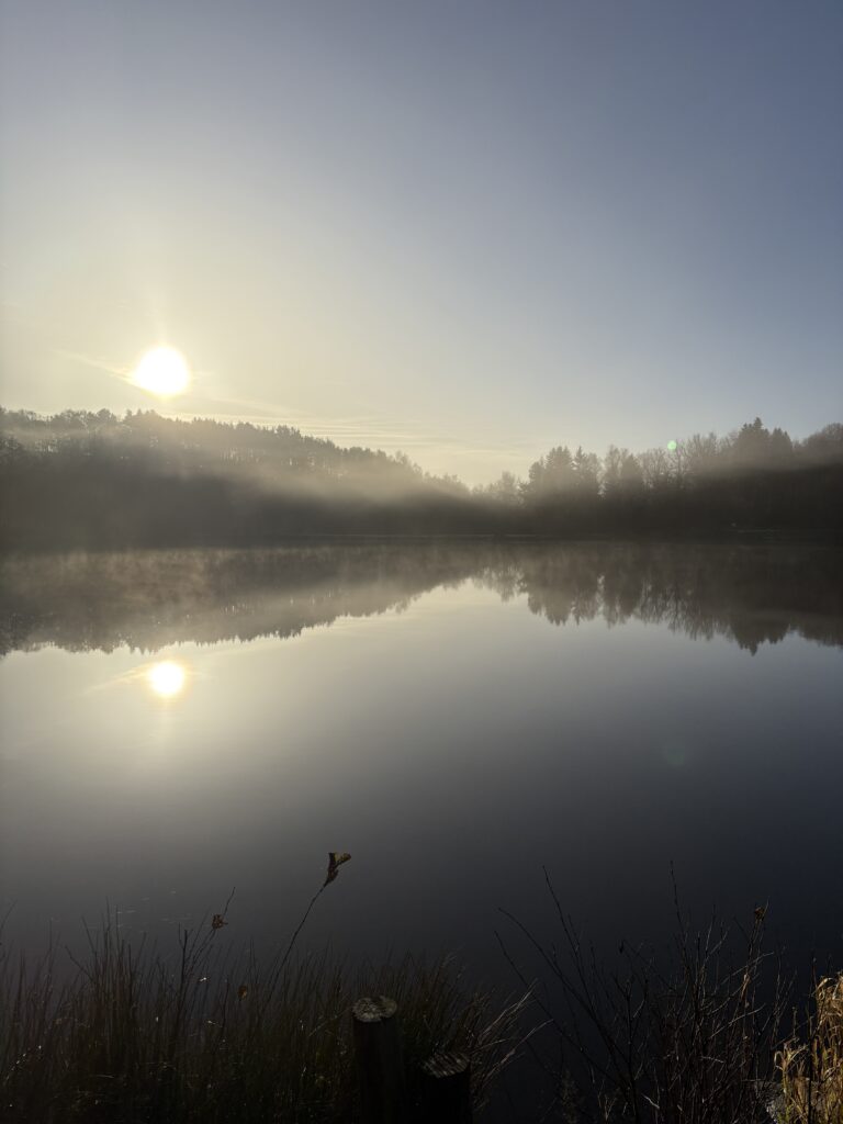La brume commence à se dissiper, et les premiers rayons de soleil transpercent le voile humide, illuminant les rives avec une douceur dorée. Le miroir de l’eau est perturbé par quelques marsouinages, signes d’une activité discrète des salmonidés présents. La scène est paisible, presque irréelle, et promet une belle journée de pêche, malgré les défis qui nous attendent.